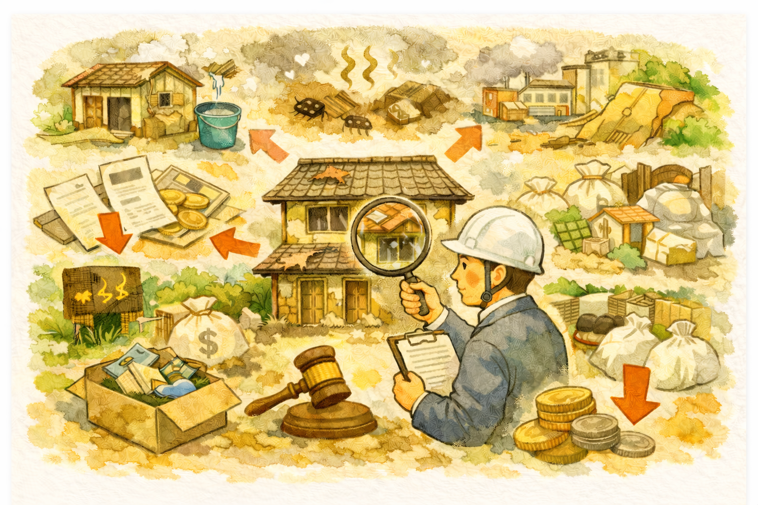 「訳あり物件」と一口にいっても中身はさまざまです。空き家買取の現場でよく問題になりやすいのは、再建築不可、共有名義の未整理、未登記の増築、越境、近隣トラブル、長屋・連棟、人の死に関する告知、擁壁やハザードリスクなどです。
