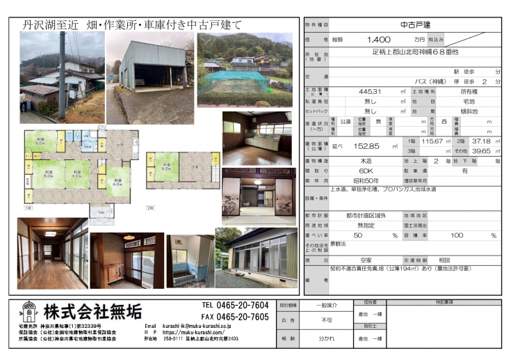 売買 丹沢湖至近 畑・作業所・車庫付き中古建て