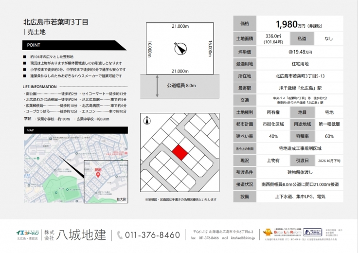 | 交通 | 中央バス「若葉町2丁目」停 徒歩約7分 乗車約4分でJR千歳線「北広島」駅 |